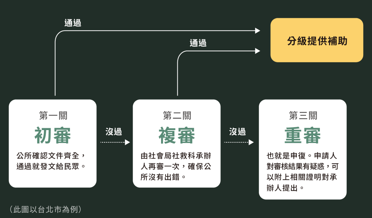 複審是第二關,由社會局(課)的工作人員負責,審查結果如果對民眾不利,會有一個複審的工作人員來做把關,再看一次資料,降低被誤判的機率。