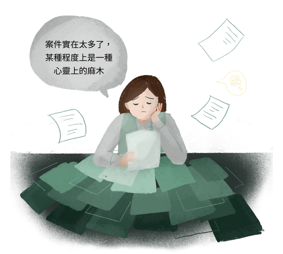 社救科承辦人俊傑苦笑表示,幾乎每個剛進來的人都很有熱情,但因為這份工作的消耗,半年後,會發現這個人熱情只剩50%,再過半年,「你會發現這個人就只是一個『審案的人』而已。」